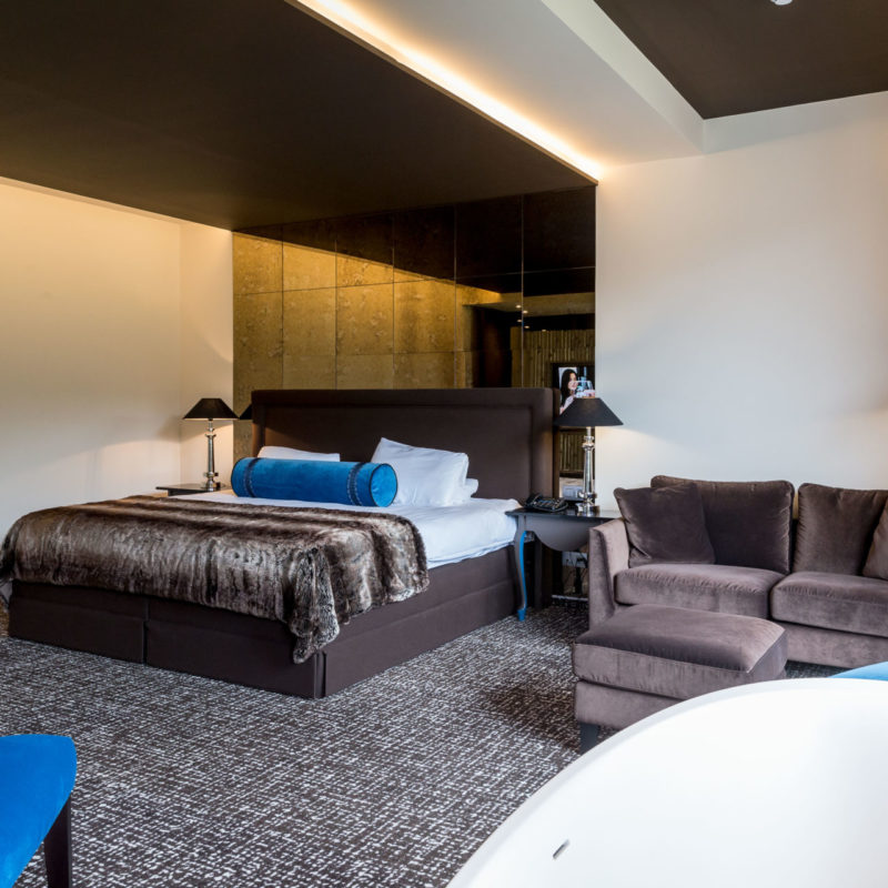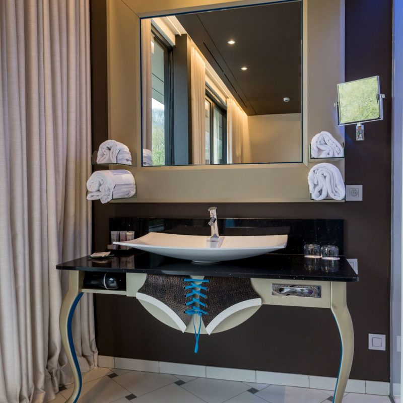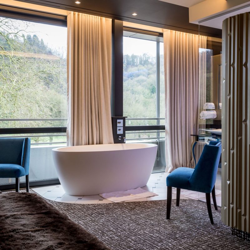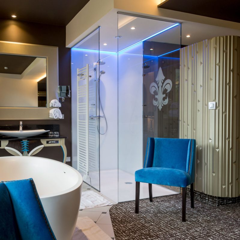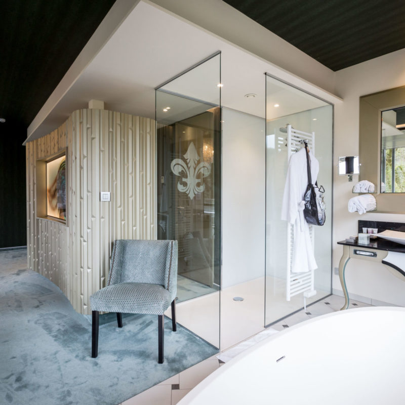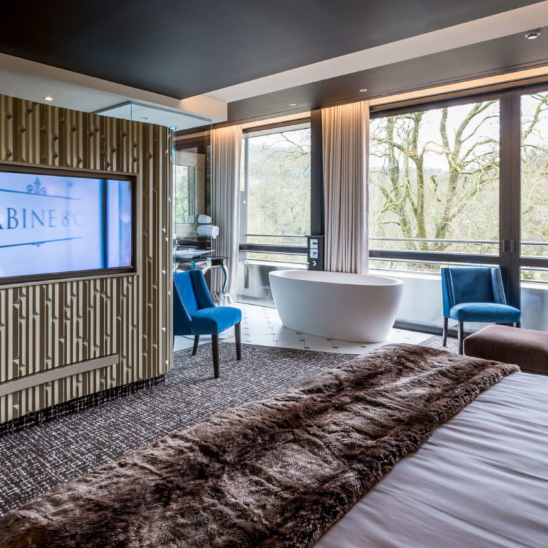 Très grande chambre avec salon (68 m2) // Lit king-size // Baignoire duo et grande douche // 2 télévisions // Vue panoramique sur le château // Grande terrasse avec grand lit suspendu.