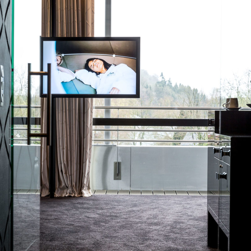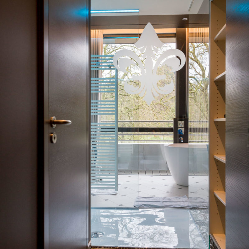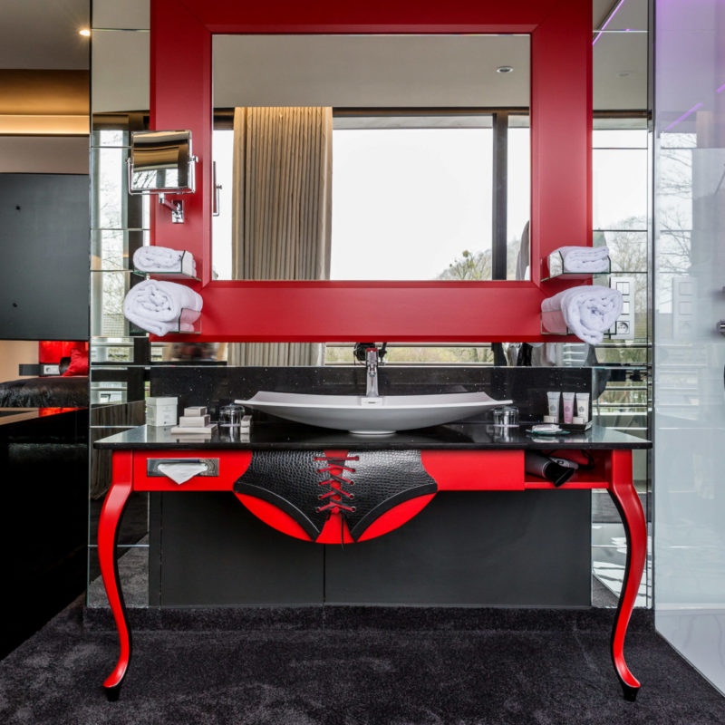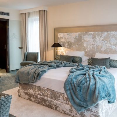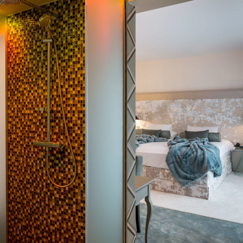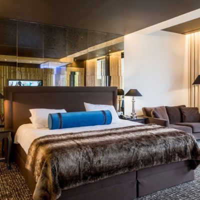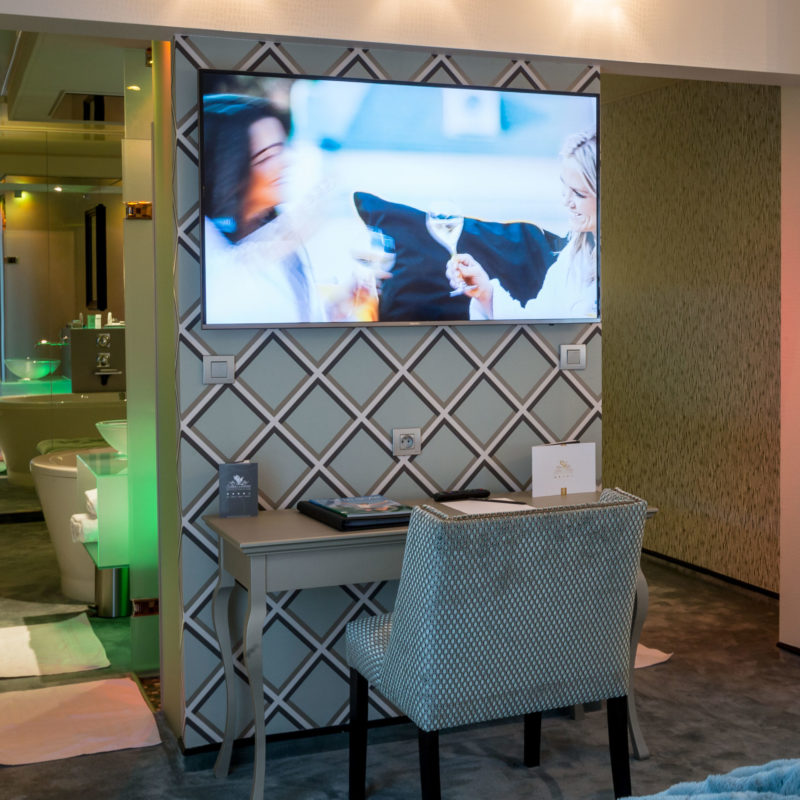 Très grande chambre avec salon (68 m2) // Lit king-size // Baignoire duo et grande douche // 2 télévisions // Vue panoramique sur le château // Grande terrasse avec grand lit suspendu.