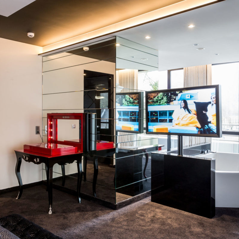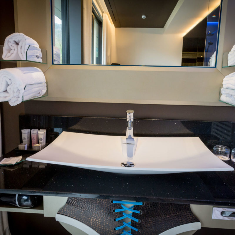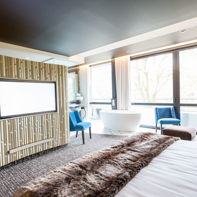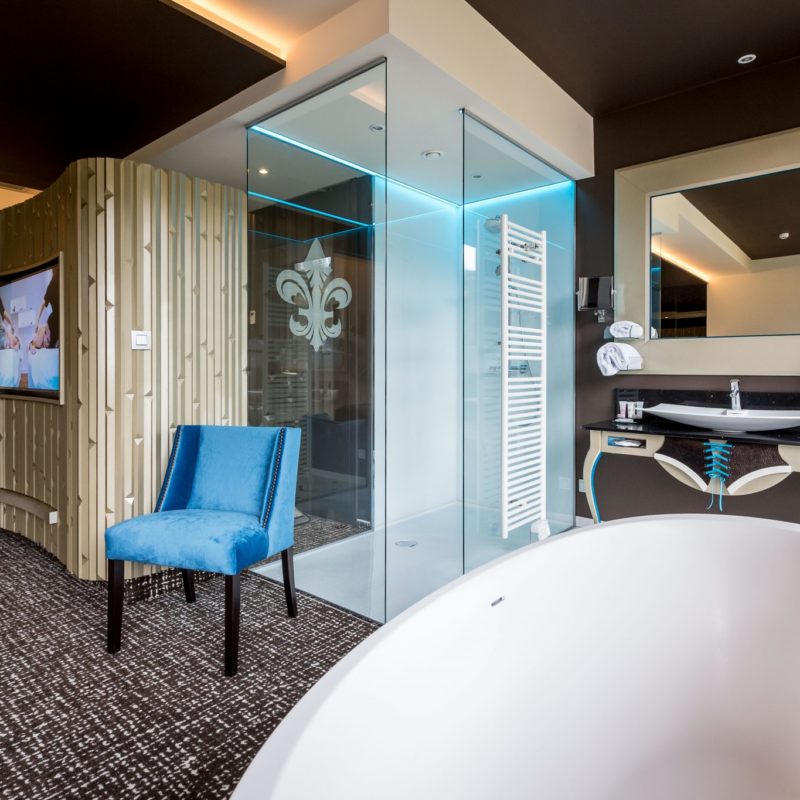Chambre 2 personnes (38 m²), lit king-size, douche, bain avec vue panoramique sur le parc, écran plasma, air climatisé, sèche-cheveux, coffre, minibar, connexion Internet gratuite, toilettes séparées.