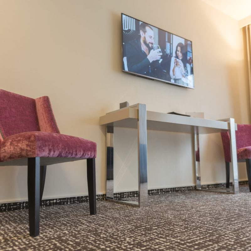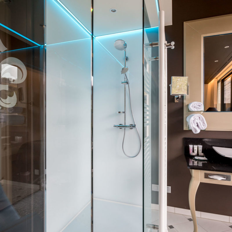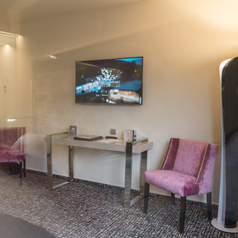 Chambre 2 personnes, douche, bain, téléphone, écran plasma, air climatisé, sèche-cheveux, coffre, minibar, connexion Internet gratuite, toilettes séparées, tisanes.