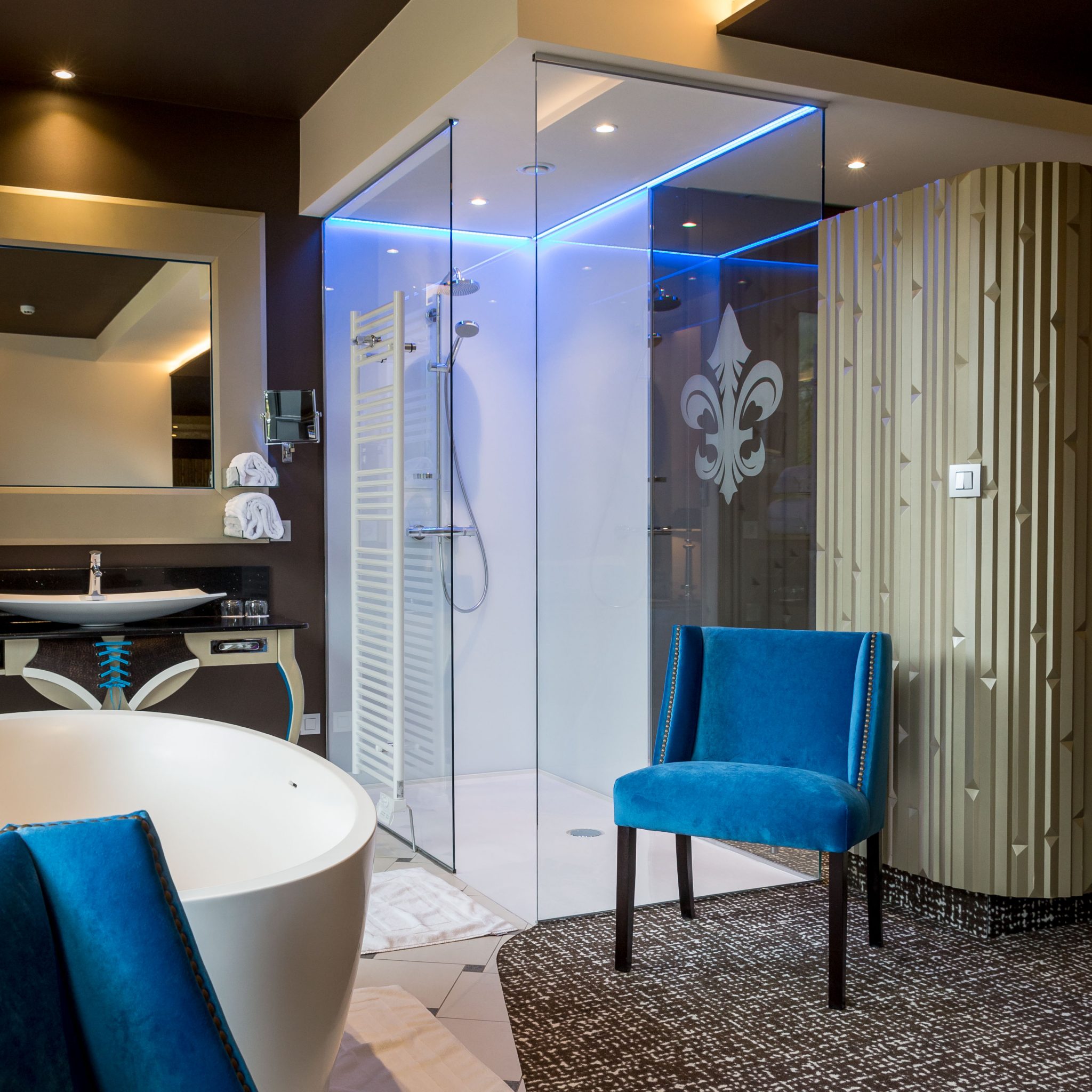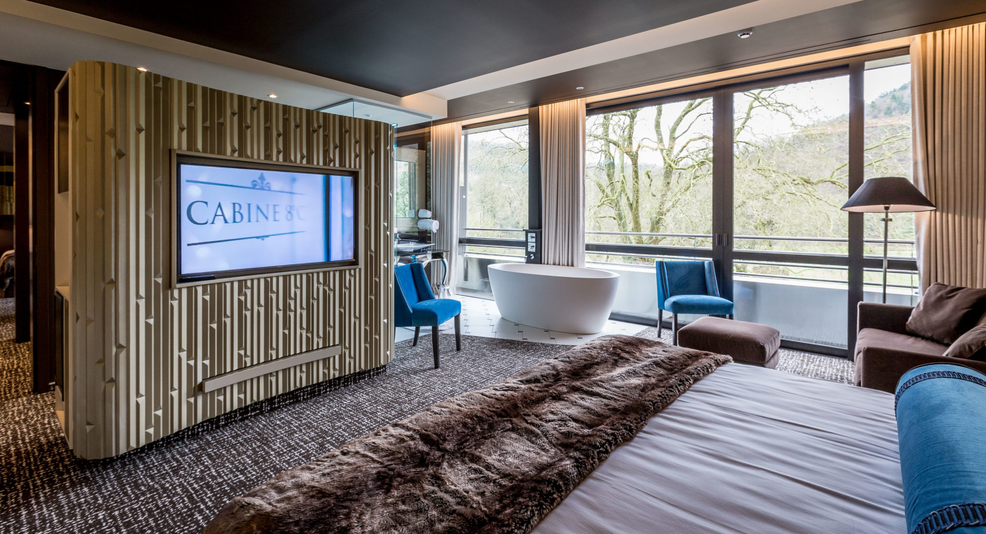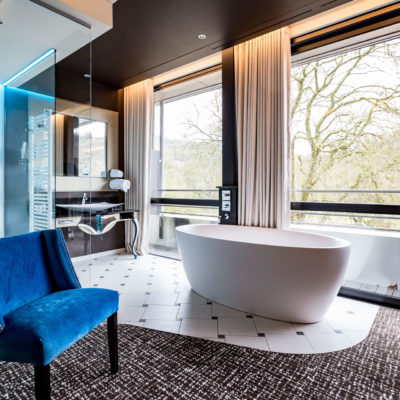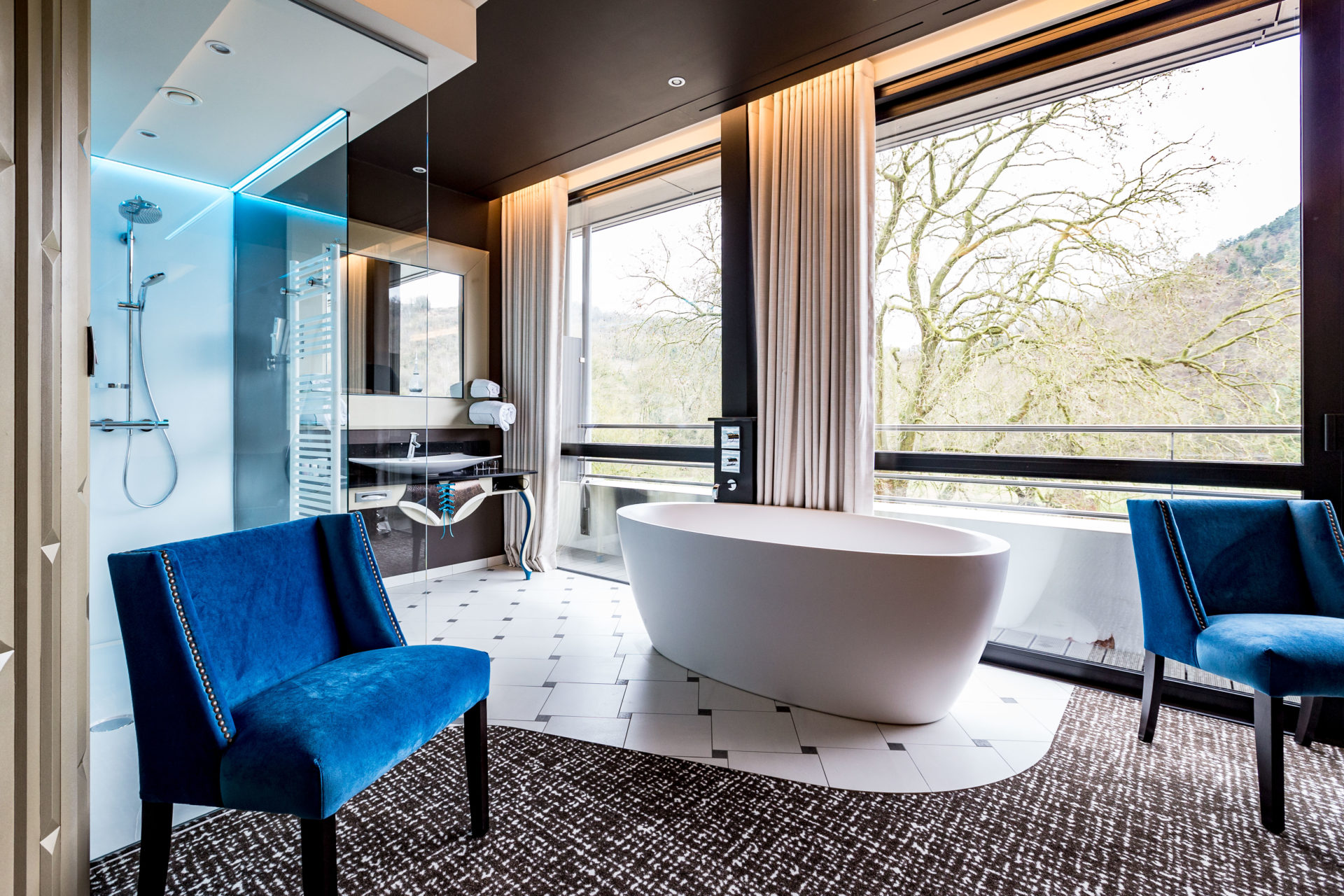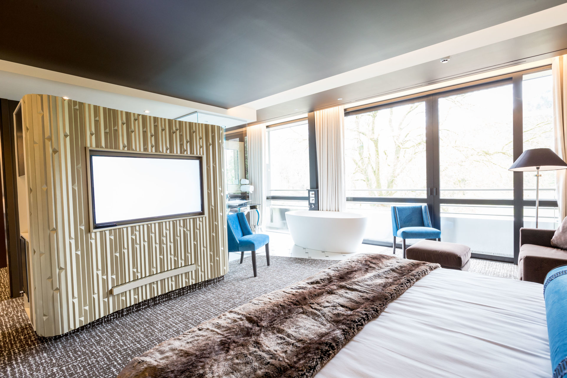 Chambre 2 personnes (38 m²), lit king-size, douche, bain avec vue panoramique sur le parc, écran plasma, air climatisé, sèche-cheveux, coffre, minibar, connexion Internet gratuite, toilettes séparées.