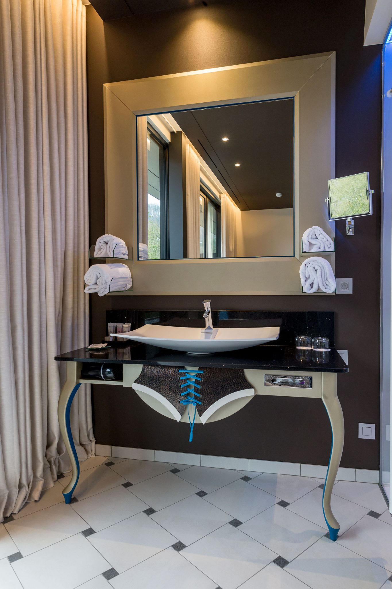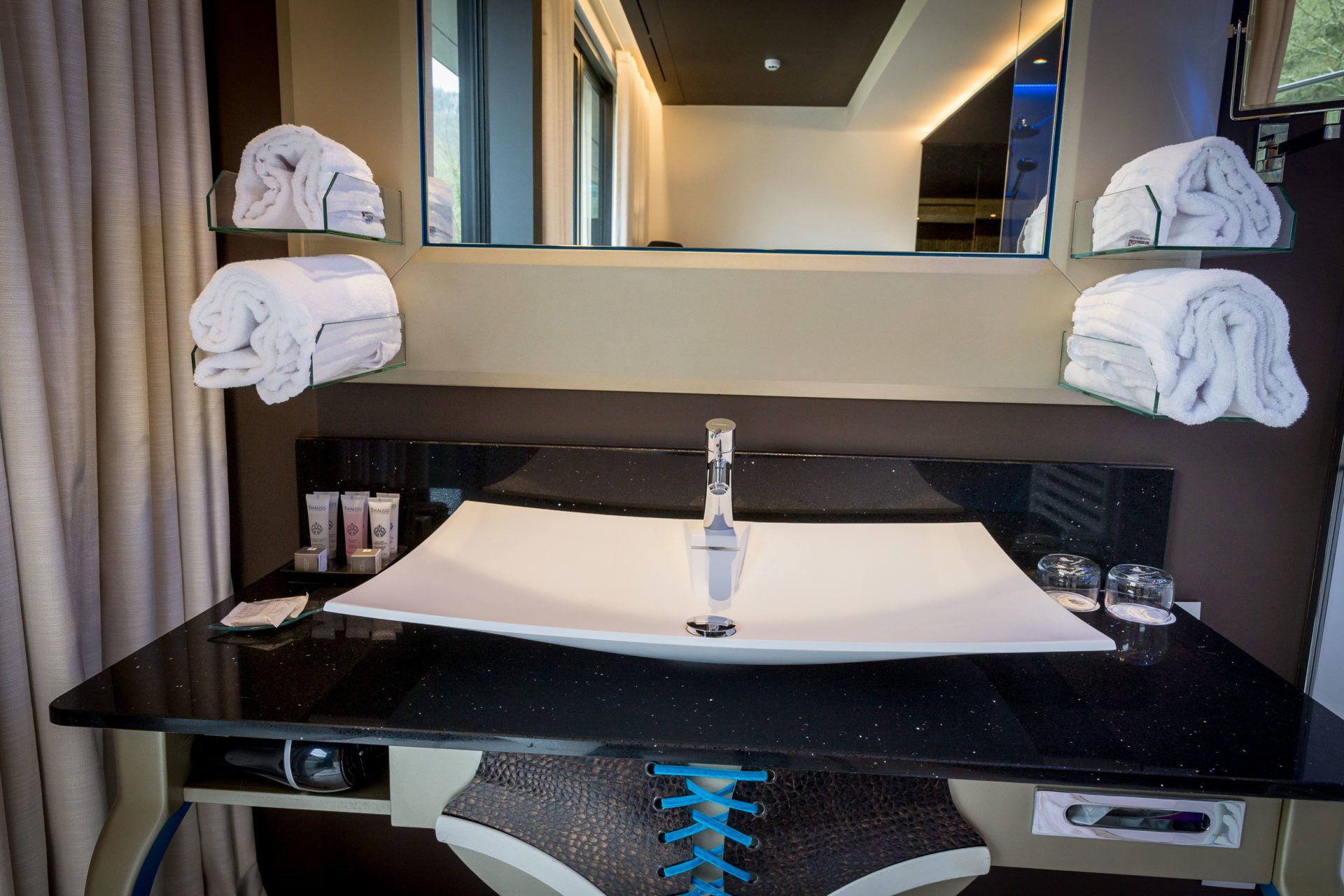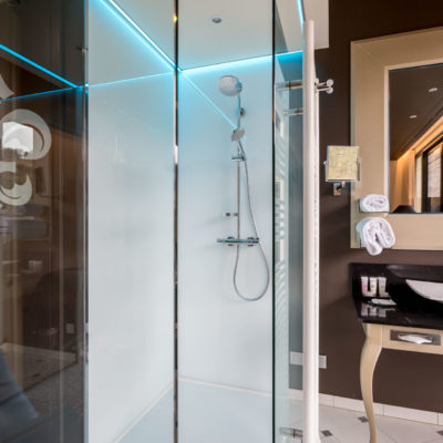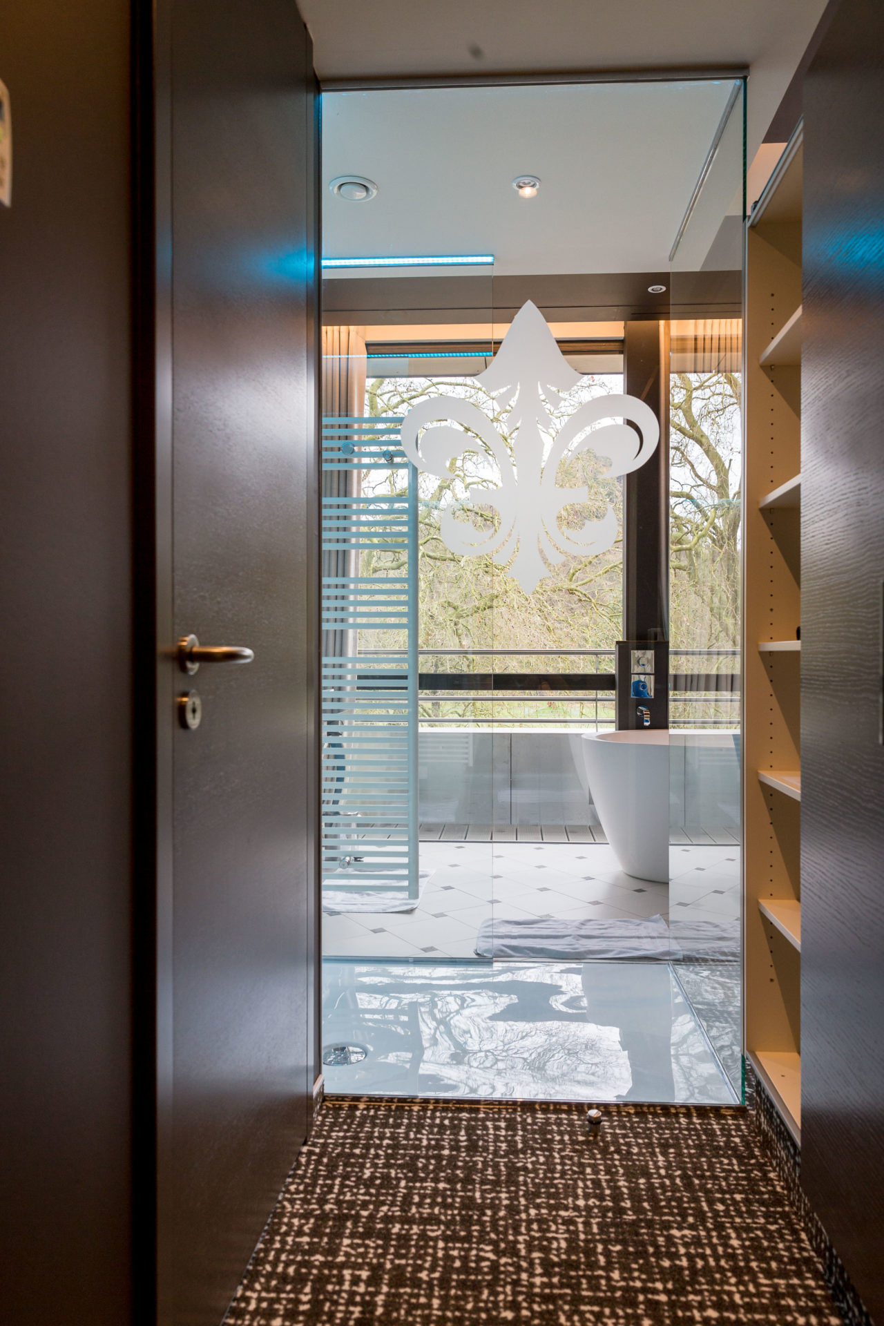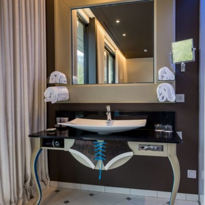 Chambre 2 personnes (38 m²), lit king-size, douche, bain avec vue panoramique sur le parc, écran plasma, air climatisé, sèche-cheveux, coffre, minibar, connexion Internet gratuite, toilettes séparées.